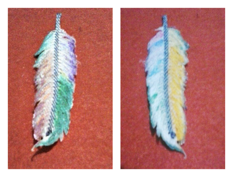 He probado pintando directamente sobre la pluma una pequeña porción con el marcador y luego con el pincel y agua diluirlo y pintar de este modo el resto de la pluma , otra prueba ha sido ; sobre un cristal , carpeta de plastico .... he hecho un buen borrón con el rotulador le añado agua y con mi pincel utilizo esta tinta improvisada para dar color a todo el fleco de la pieza . Una tercera prueba ha sido con el rotulador directamente sobre las partes exteriores de los flecos sin diluir . Otra opción sería añadir el color a la cola cuando estamos en el proceso de fijar los flecos ( pero esto se me ha ocurrido cuando ya estaban las plumas fijadas...)