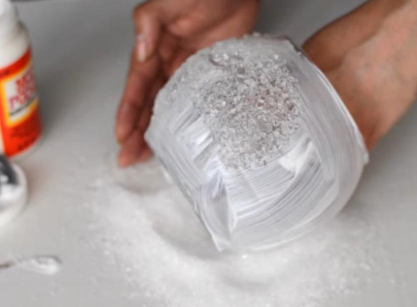 Mezcla la sal con la purpurina. Da una capa de cola blanca al recipiente con ayuda de un pincel y espolvorea la mezcla por encima.