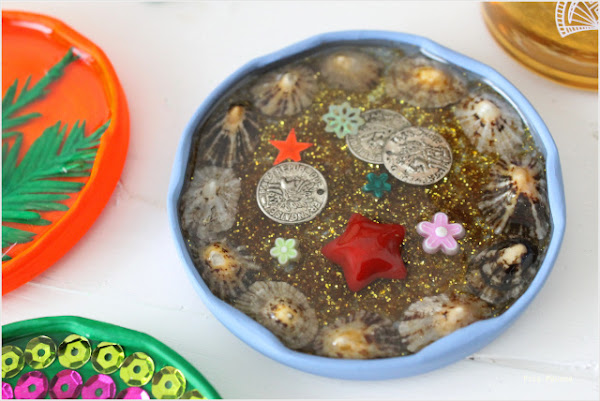 El posavasos del fondo del mar se me ocurrió como un homenaje a esos coches de nuestra infancia que te contaba al principio del post. Busqué por toda la casa y a pesar del diogenismo de #laniña, curiosamente no encontré ni un solo pez. Así que me imaginé un tesoro pirata con monedas, plantas submarinas y estrellas de mar.