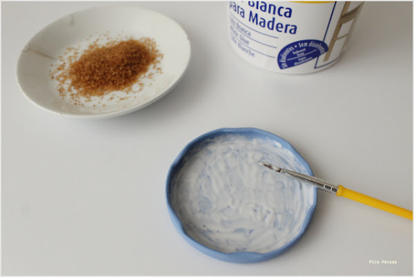 Lo que más miedo me daba era la reacción del azúcar y la purpurina en contacto con el barniz, por si se disolvía o se despegaba del fondo y quedaba flotando, pero no hubo ningún problema, todo se quedó en su sitio y la purpurina se ve brillante.