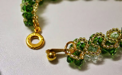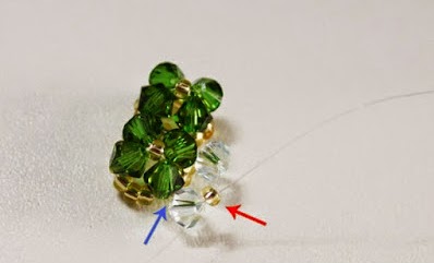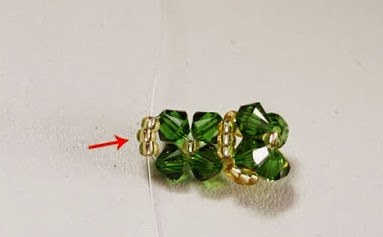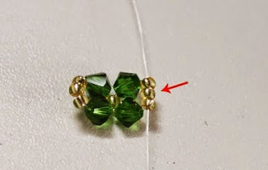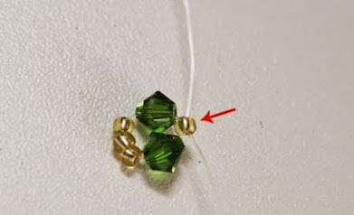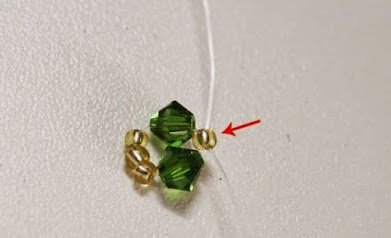 MATERIALES: Hilo de pescar. Cuencas blancas, verde esmeralda. Cuencas doradas del tamaño de un botón. Broche dorado. PROCEDIMIENTO: 1-Pasar las cuencas por el hilo de pescar como lo muestra la imagen, siguiendo la misma orden.