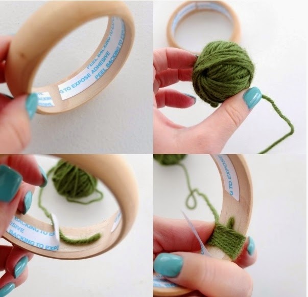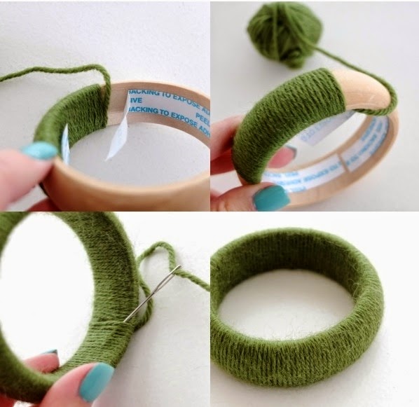 PROCEDIMIENTO:1-Colocamos nuestros materiales sobre la mesa de trabajo la pulsera y la lana, luego colocar una cinta con pegamento y con ayuda de esta pegar la punta del ovillo de lana y empezar a dar vuelta, como vemos en la imagen.