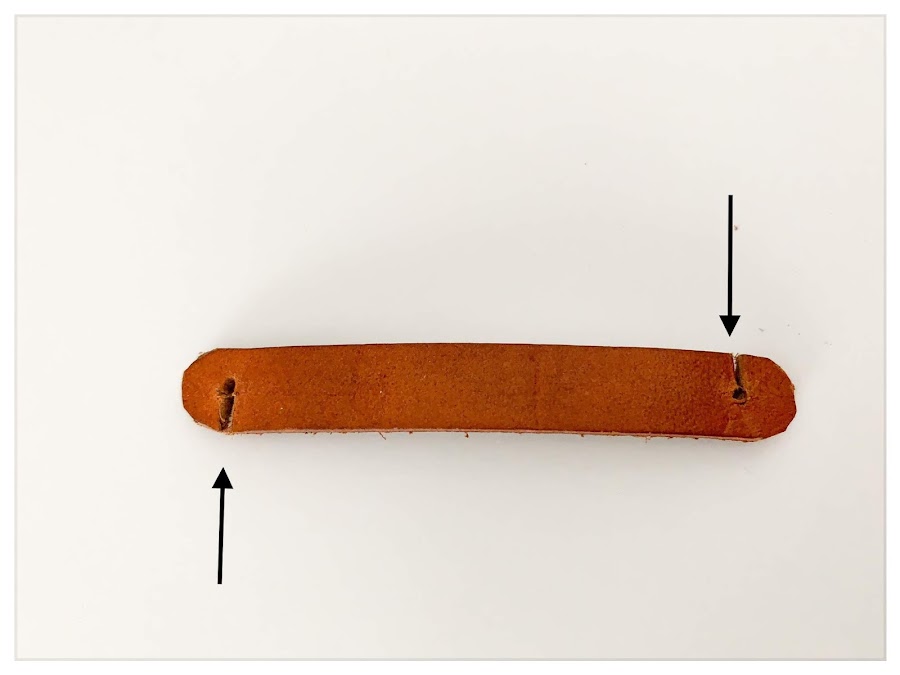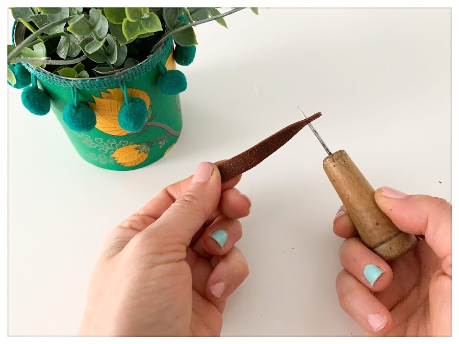 Con el punzón hacer los agujeros de los extremos de las cruces sobre el cuero traspasando
