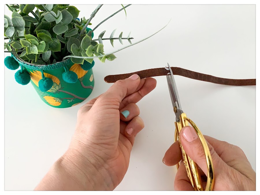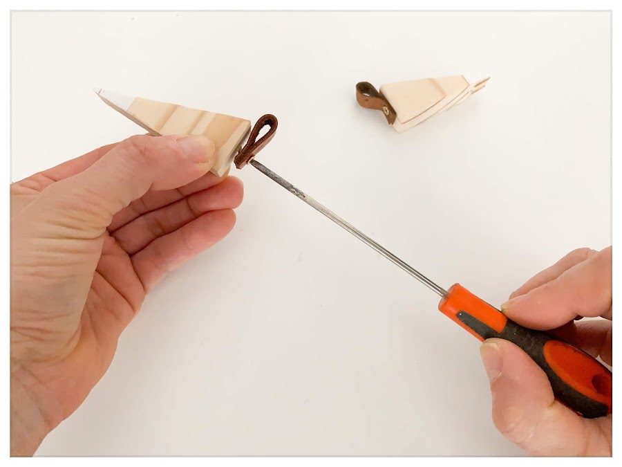 Cortar la cinta de cuero y sujetarla a la madera con un tornillo de color dorado utilizando un destornillador.