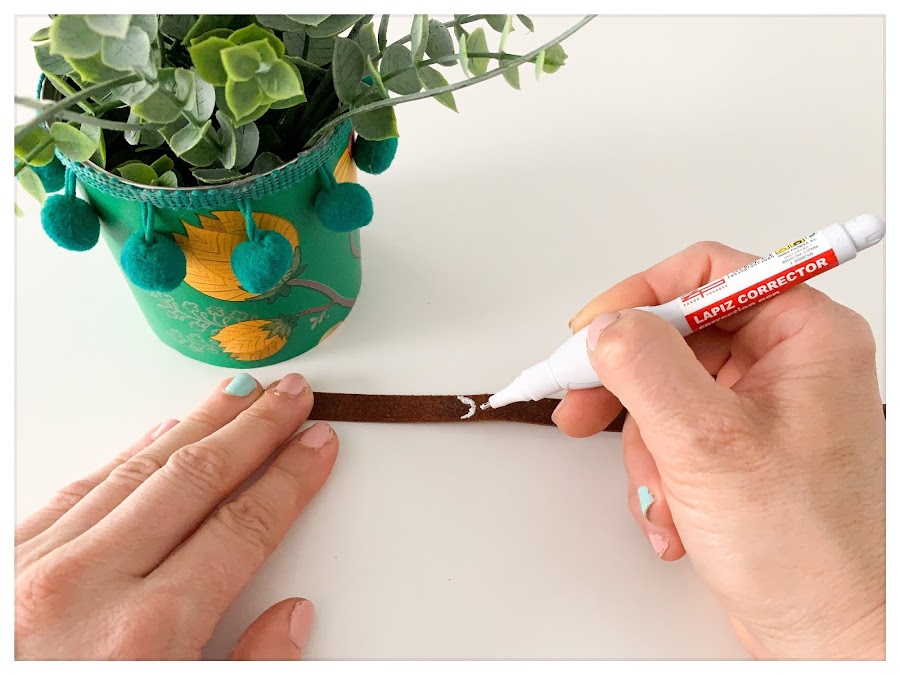 tornillo dorado, pintura acrílica blanca, pincel y cinta de cuero .