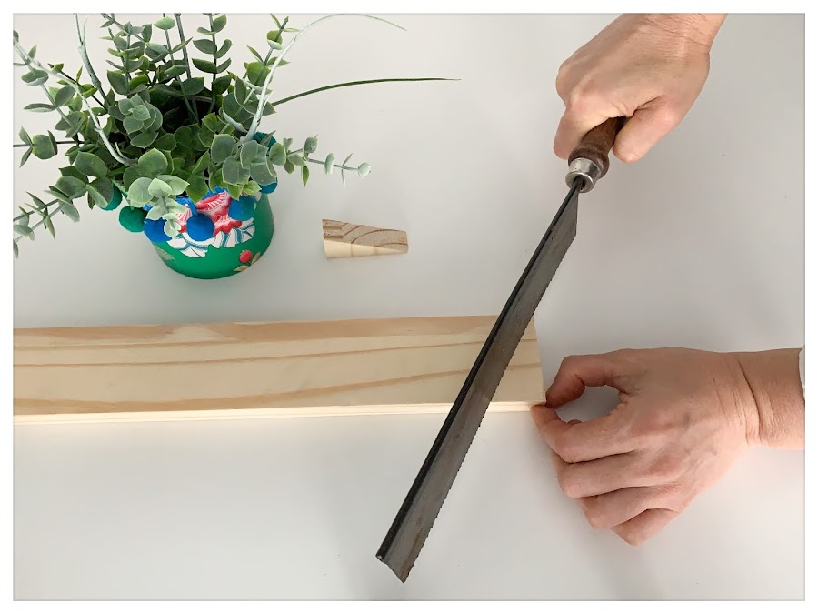Cortar la madera formando ángulo de 45 grados, haciendo una cuña de madera, en un extremo