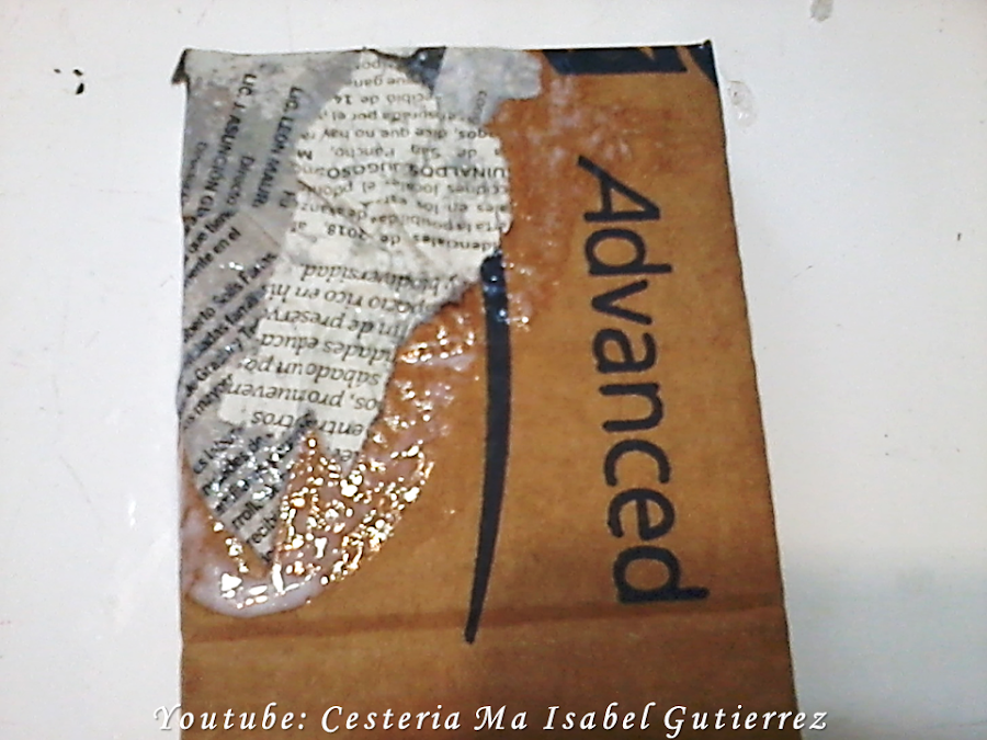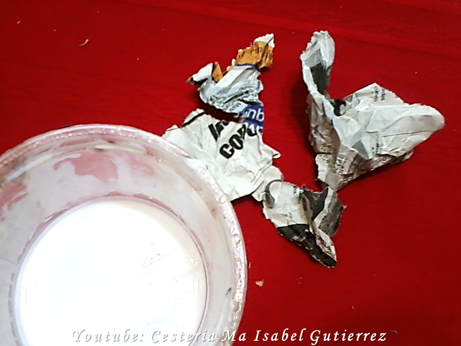 Aparte, vamos a arrugar pedazos pequeños de papel de diario y hacemos una mezcla muy aguada de pegamento o cola blanca con agua....