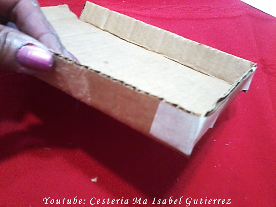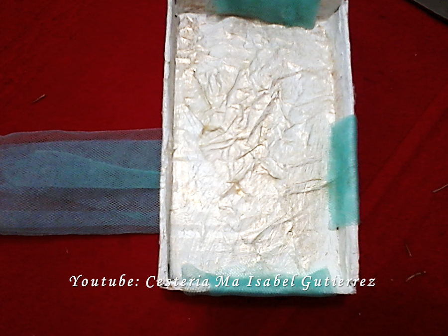 Estas tiras van a ir pegadas con silicón a lo largo de la cajita y también horizontalmente como se muestra en la imagen... Solo debemos poner silicón en los extremos de las tiras de tela, por la parte interna de la cajita...