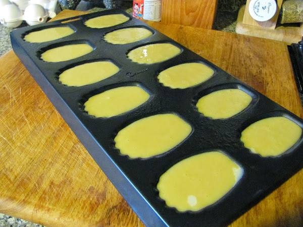 4.- Preparar el molde para madeleins, engrasándolo con aceite en spray. Poner 2 cucharadas soperas de mezcla en cada cuenco del molde, procurando dejar por lo menos un medio centímetro del borde, tal como se observa en la foto aqui arriba. La mezcla preparada es suficiente para completar los 12 espacios del molde.