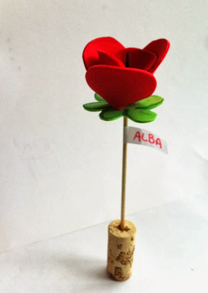 Una vez terminada la rosa de goma la puedes pegar en algún soporte para que se mantengan rectas y poderlas usar de adorno. En mi caso he aprovechado unos corchos de botellas de vino, les he hecho un pequeño agujero y así se mantienen rectas.