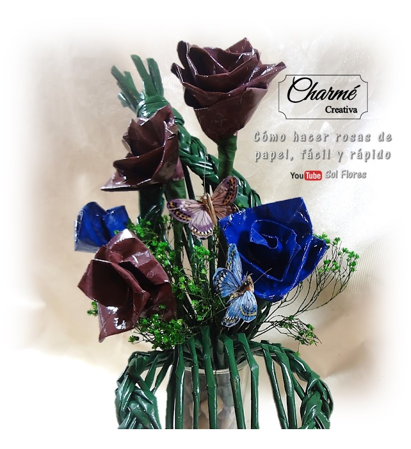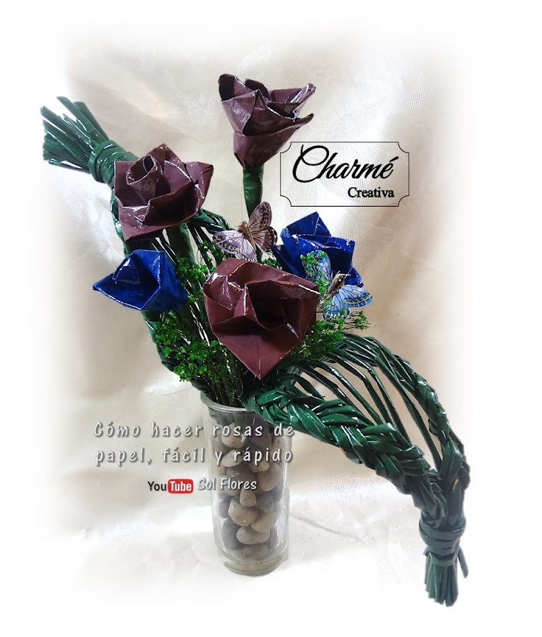 Y así quedó mi arreglo, es pequeño, yo le puse estas mariposas y esta nube verde que me encontré entre mis cosas, y le hice esta imitación de hoja con varillas de papel, si quieren que les cuente como la hice me lo dicen en los comentarios, ¿sí? Y de florero le puse un vaso de cristal con piedras decorativas, ¿qué me dicen, les gusta mi arreglo de rosas de papel? Nos vemos en el próximo vídeo, besos.