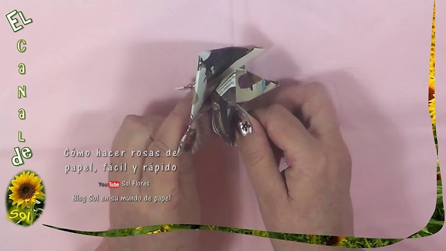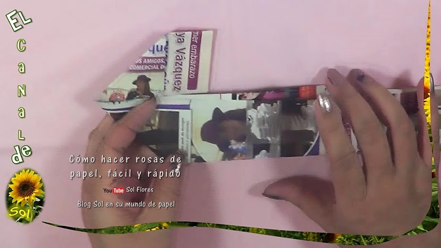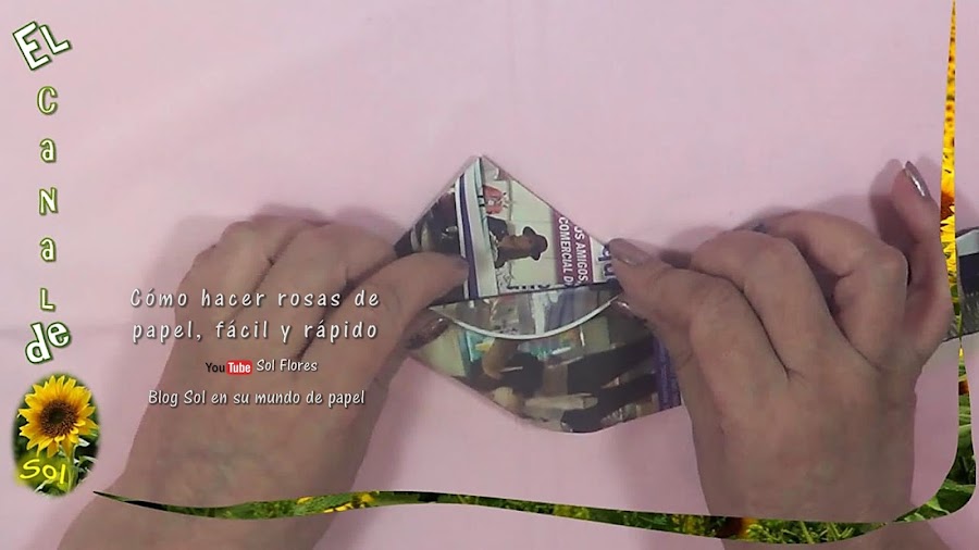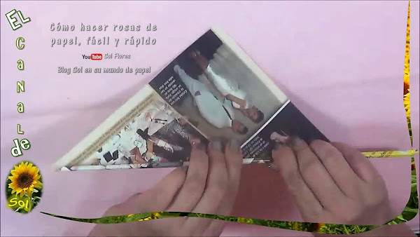 el extremo de abajo lo envolvemos y lo introducimos en el centro, giramos para darle forma, y envolvemos el sobrante, así nos queda una hermosa rosa que podemos dejar sin pintar aprovechando los colores de la revista,