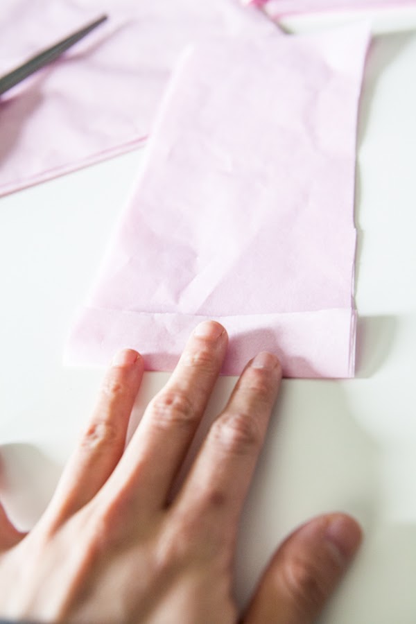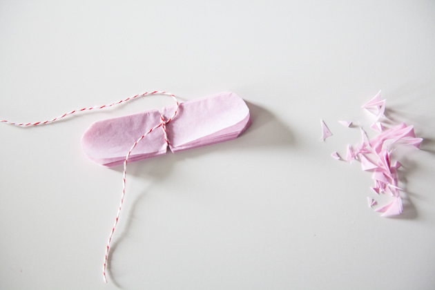 Por el centro, en donde cortamos el triángulo, atamos una cinta o un cordón.