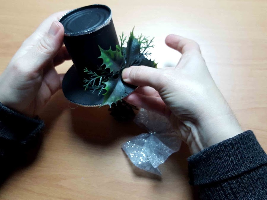 Se le pega la cinta o la cuerda en el borde del sombrero en el medio y arriba. Finalmente se decora a vuestro gusto pegando las decoraciones.