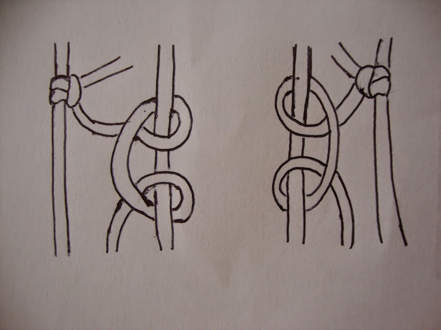 4- Lo anudamos de arriba hacia abajo ( y del exterior hacia el interior como antes). Tensamos y pasamos la hebra del ovillo hacia el lado izquierdo para repetir lo mismo sobre el cordón central izquierdo.