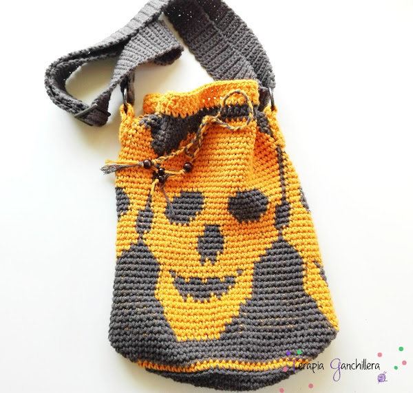 Y ahora te explico... el gráfico que yo quería lo encontré en Pinterest hace mucho tiempo (y como hago siempre lo guardé), pero fue cuando pensé en hacer este bolso con calaveras que vi que el enlace me llevaba al blog de su creadora Monster crochet, y que formaba parte de un esqueleto entero y que su propietaria lo vende en Etsy.