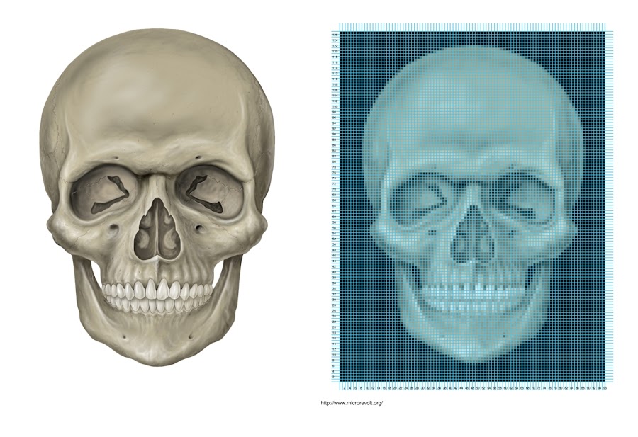 Con este gráfico que verás a continuación fue con el que hice mi bolso. Primero elegí una calavera, la modifiqué a la forma que quería darle (delimité el nuevo contorno y rellené de cruces la parte que quería), pensando en la forma que le daría al nuevo bolso y calculando los puntos para intentar cuadrar varias calaveras alrededor de él (por cierto, que sigo siendo malísima con las medidas).