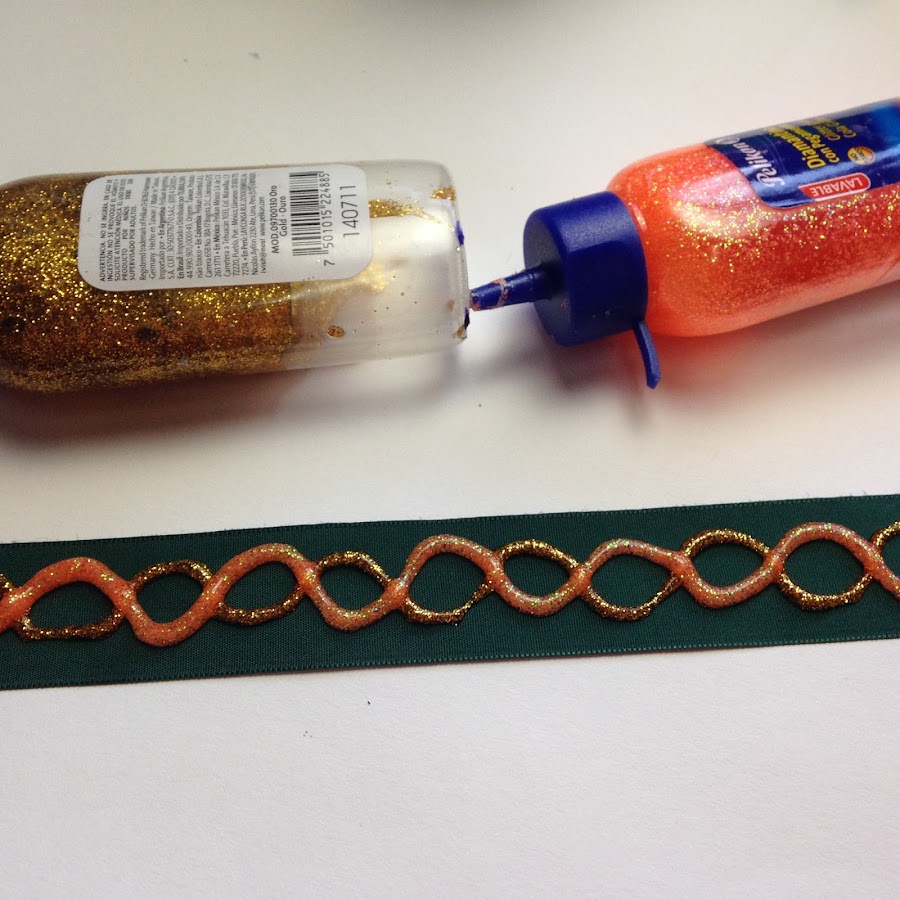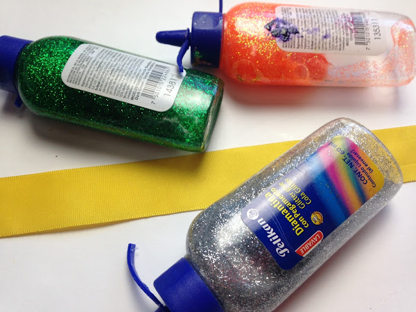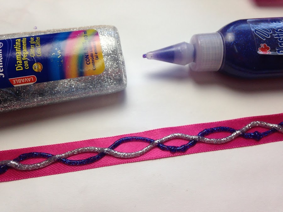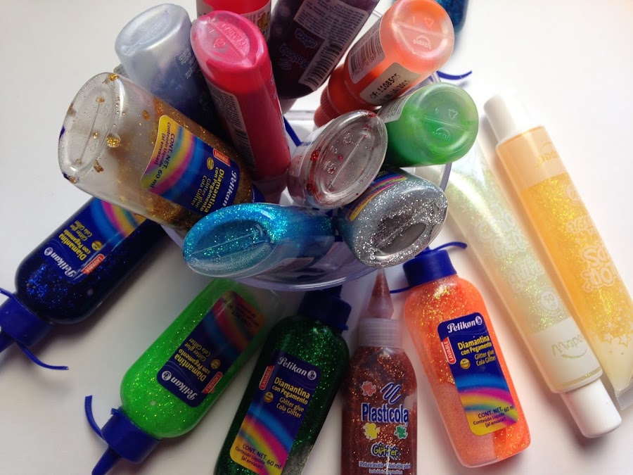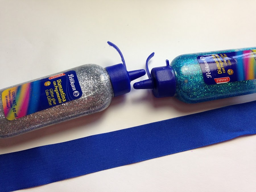 Para hacer la decoración utilicé glitter, el mismo que usan los niños en la escuela que no es mas que pegamento con brillantina, existen muchísimas marcas, yo probe 3 marcas con muy buen resultado.
