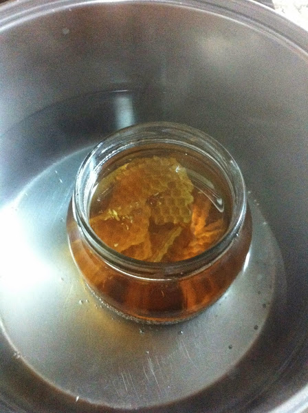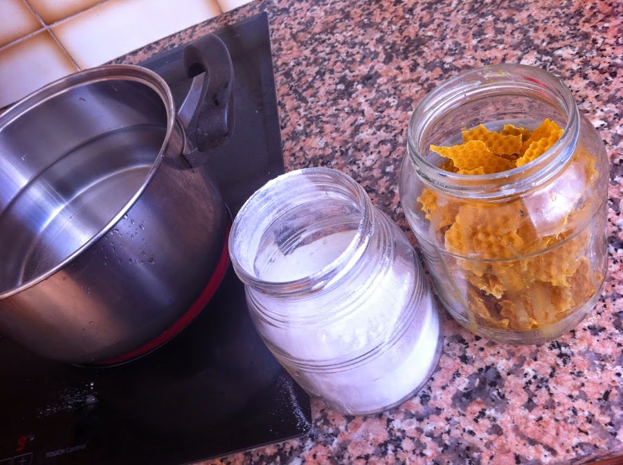 Este polvo blanco de la resina se mete en un bote de cristal y se pone al baño maria, es decir, se calienta en una cazuela con agua a fuego lento (con el barniz metido en el bote de cristal y éste dentro de la cazuela).