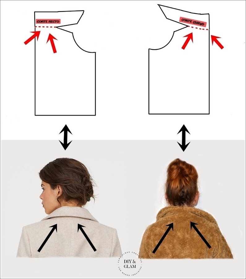 Otro punto importante a tener en cuenta es cómo dibujar el cuello del abrigo en el patrón trasero. En función de cómo lo planteemos que dará de una manera o de otra.