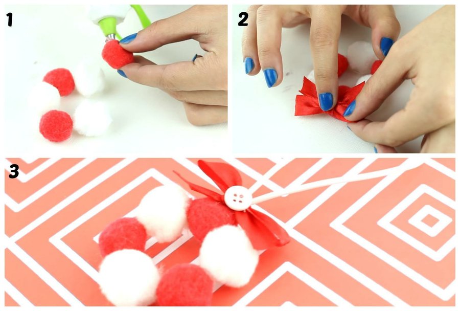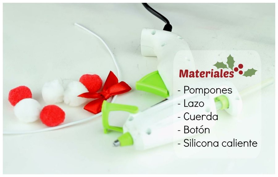 Es tan fácil como pegar los pompones unos con otros hasta formar un círculo. Utiliza más o menos pompones dependiendo del tamaño que quieras. Dale el último toque pegando un lazo y un botón. Solo quedará ponerle la cuerda para colgarlo del árbol de Navidad.