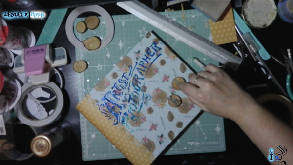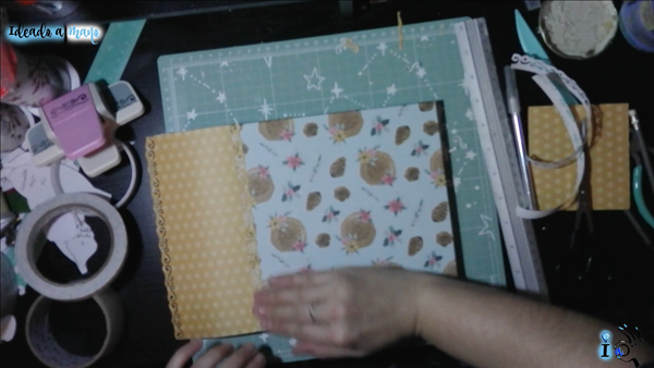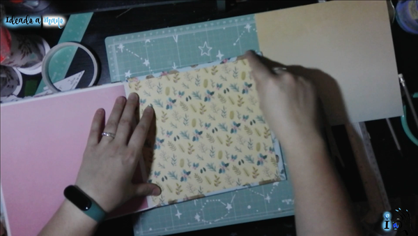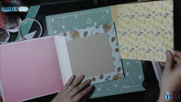 Cuando ya ha secado vamos a pegar encima de las cartilunas los papeles de scrap que nos gusten. Los recortamos con unos milímetros menos que el tamaño de la hoja. Se pueden pegar con cinta de doble cara, no es necesario pegarlo con pegamento.