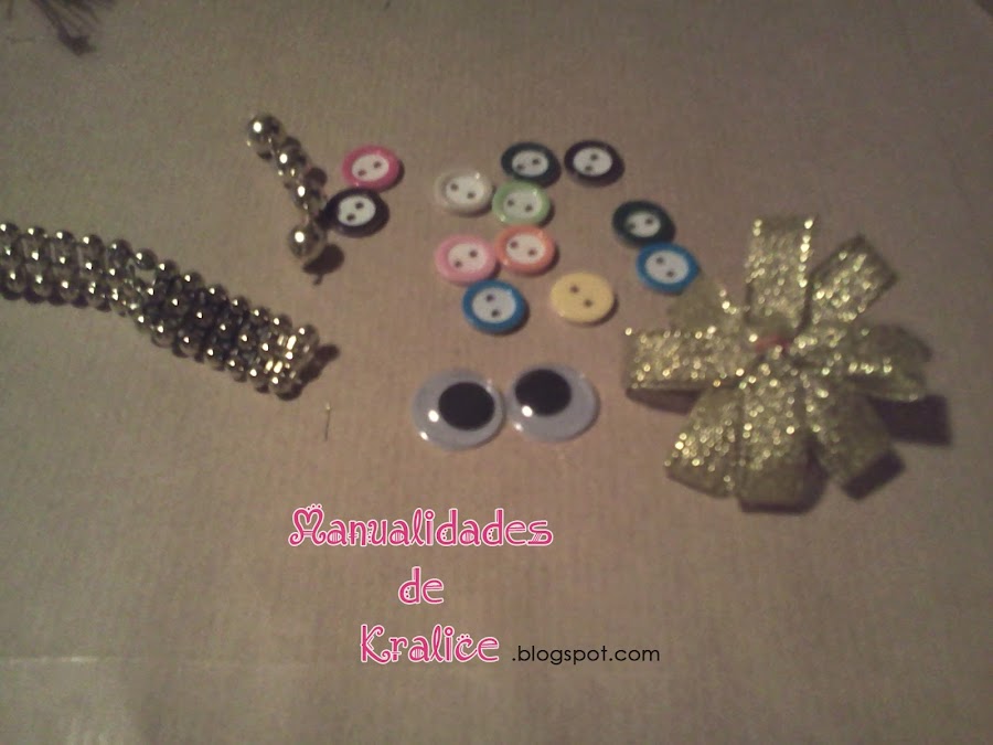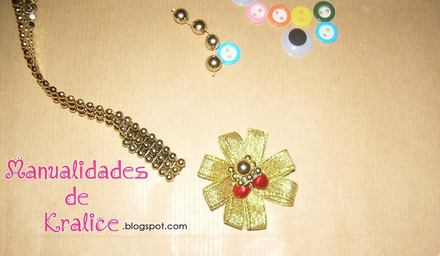 Cinta dorada, cascabeles, un cuadradito decorativo y una bolita para el lacito