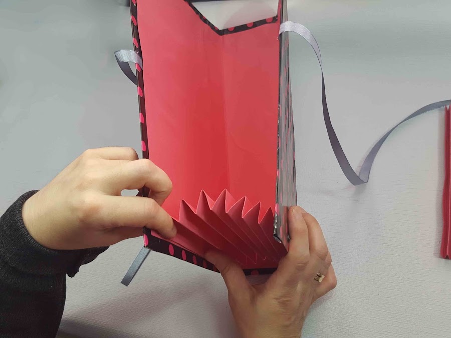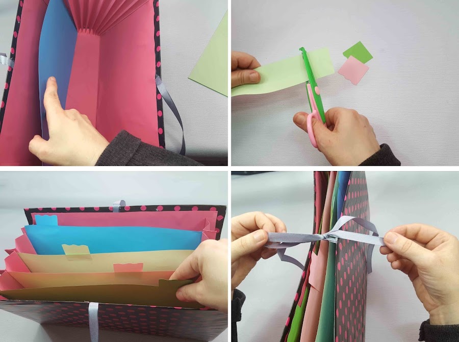 Colocamos y pegamos cartulinas de colores, dejando un espacio entre una y otra para poder guardar los documentos o notas. Por último cortamos trozos de cartulina de los mismos colores que los separadores y los pegamos. Para cerrarlo le atamos un lazo.