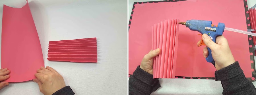 Para hacer los separadores. le hacemos unas dobleces a los rectángulos de cartulina en forma de abanico. Las medidas de éstas cartulinas son de 32 x 17 cm pero las medidas pueden variar según la medida de tu caja de cereales. Ahora sólo las tenemos que pegar a los lados.