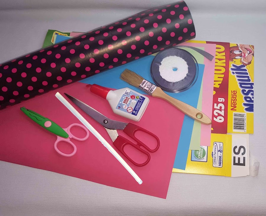 Extenderemos otra vez cola blanca para pegar cartulina encima. La cartulina debe ser un cm de cada lado más pequeña que la medida del cartón de cereales. Le marcamos los pliegues y dejamos secar completamente.