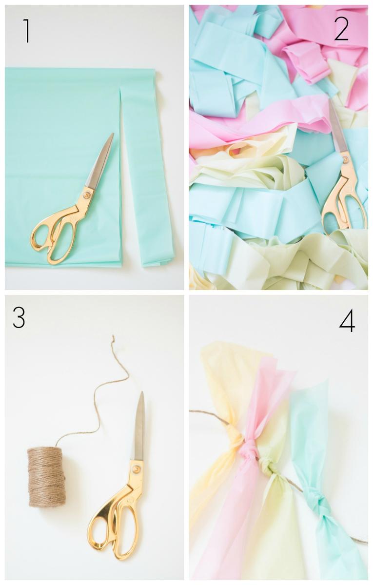 Tomar la cinta o cordón del largo deseado, y atar de a una las tiras cortadas anteriormente, dejando unos 10 cm de sobrante en la parte superior. Acomodar las tiras, o los nudos mejor dicho, uno pegado al otro bien juntos para crear un telón de tiras bien tupido.