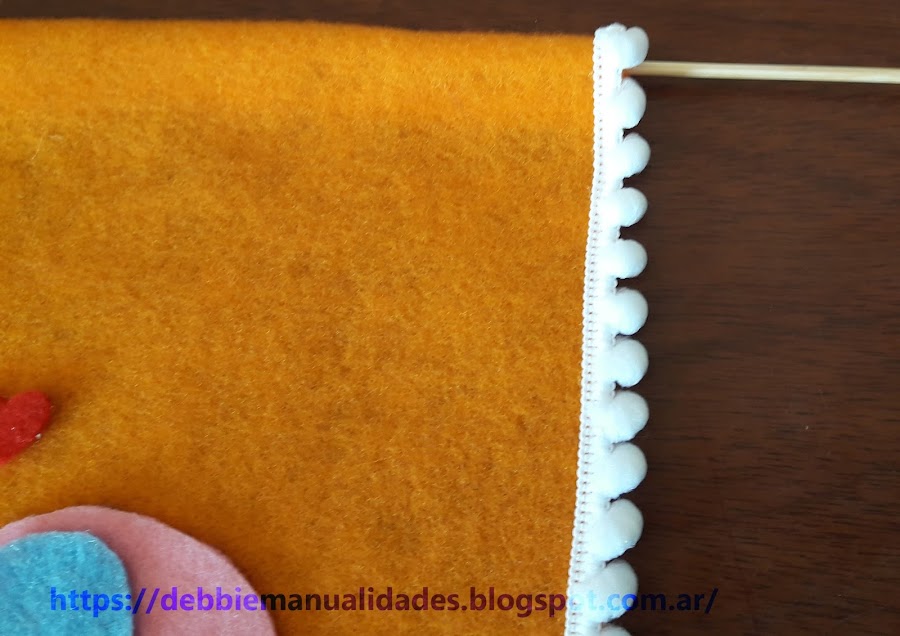Para que tenga una terminación más bonita, en el borde coloque una cinta con pompones