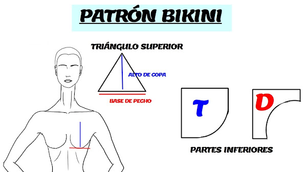 La parte inferior vamos a sacar el patrón de unas braguitas que nos sienten bien, y la parte de arriba vamos a hacer 2 triángulos, tomando como referencia las medidas que os pongo en la foto inferior
