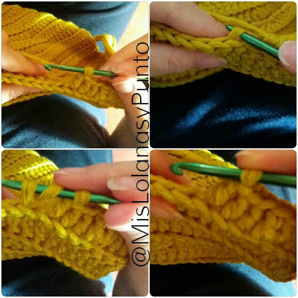 4º vuelta.- Hacemos 13 puntos altos, 1 aumento, 5 puntos altos, 1 aumento y 14 puntos altos. Total 37 puntos altos.