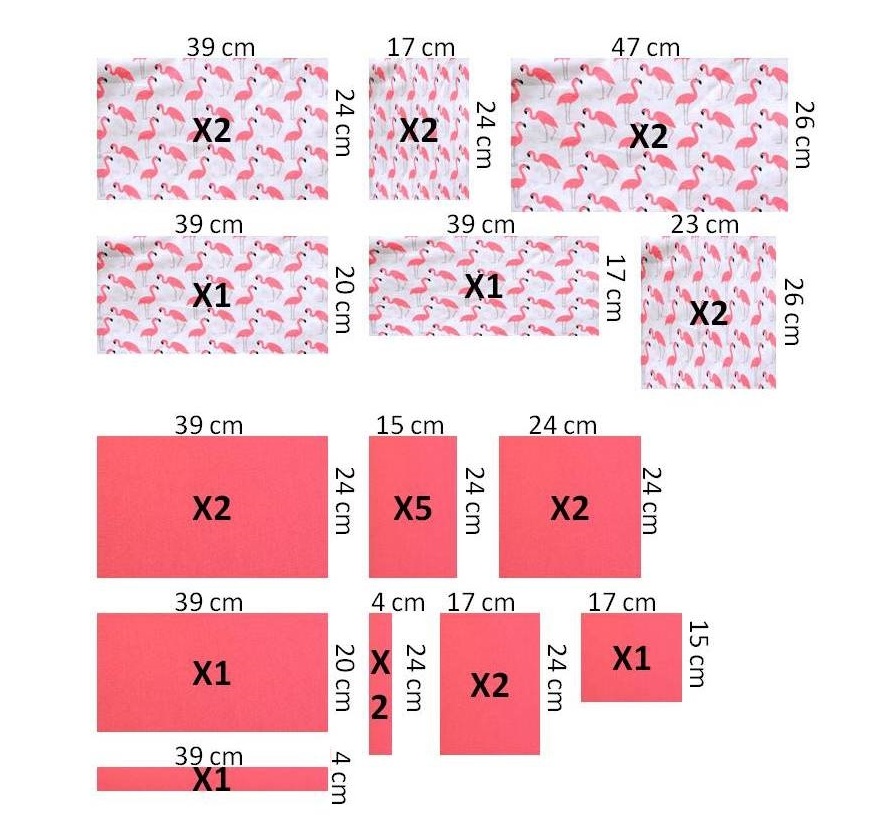 Una vez tengamos todos los materiales, debemos cortar las siguientes piezas de tela, tanto del exterior como de forro: