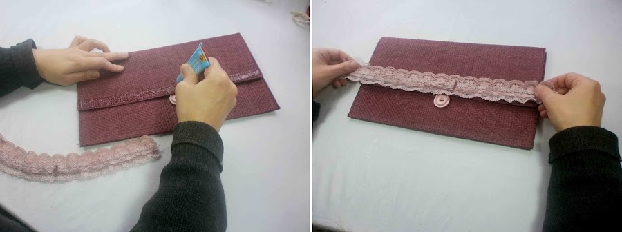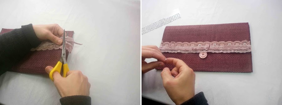 Decoralo como prefieras. Si decides poner la puntilla, primero aplica pegamento y recorta el sobrante. Pegar el strass .