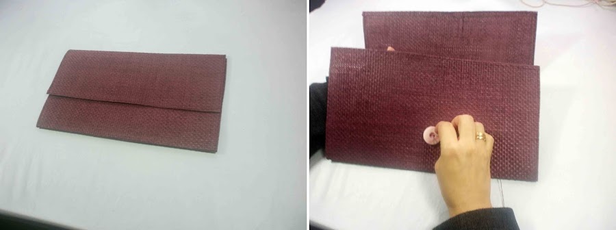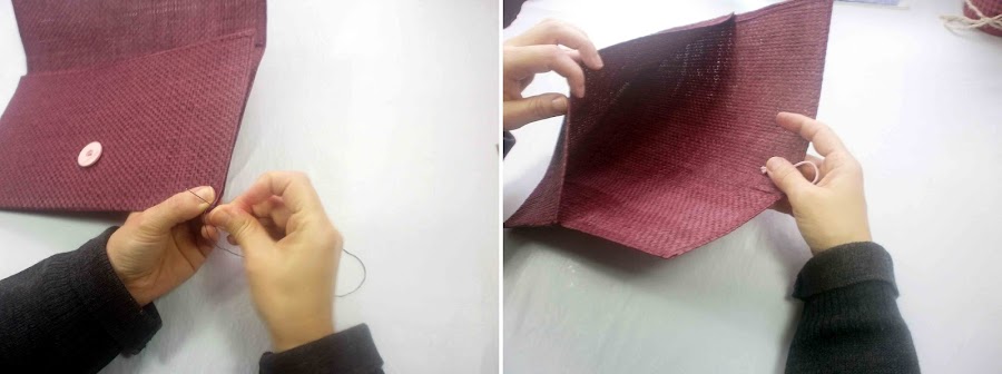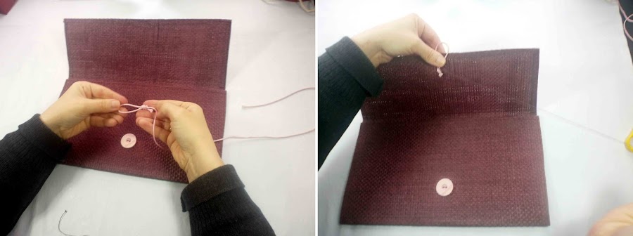 Strass adhesivo ( opcional )Se dobla el mantel individual en dos partes, se cose el botón y un trozo de cuerda amarrada.