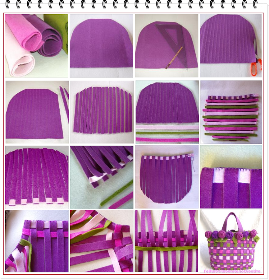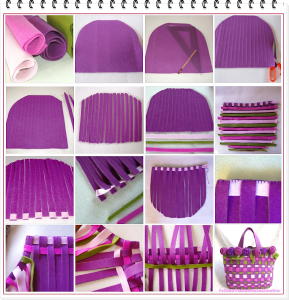 Recortamos varias tiras de fieltro en los colores elegidos, luego observamos la imagen y entrelazamos las tiras, hasta lograr este hermoso bolso de tiras de fieltro.