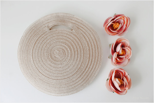 Precisamente para darle un aire nuevo y de paso combinar con los zapatos, me he hecho un bolso de fiesta DIY con dos manteles individuales redondos y unas flores artificiales: