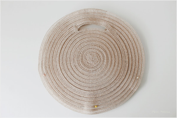 # Paso 1 (opcional): Reduce el tamaño de los manteles. Los originales medían 38 cm. de diámetro, una enormidad para llevar como clutch o bolsito de fiesta. Así que me puse a desenrollar fibras hasta alcanzar unos manejables 25 cm. De aquí es de donde saqué el hilo transparente para coser. Vas tirando de las fibras y junto a ellas, sale el hilo también: