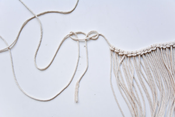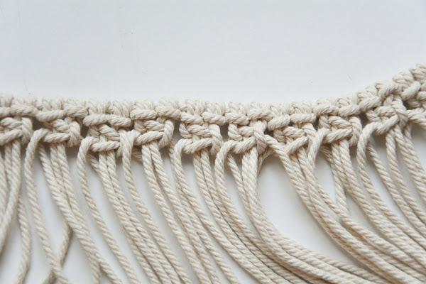 Ahora que ya tenemos todas las cuerdas colocadas ya podemos empezar a hacer nudos. xD Y en este caso no puede ser más fácil porque solo vamos a usar el nudo básico de macramé en todo el bolso: el nudo plano.