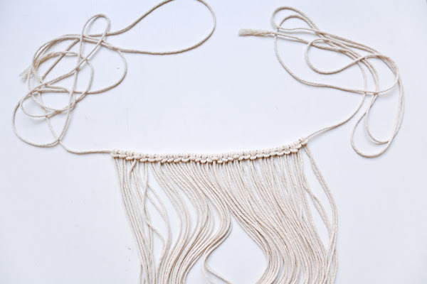 En total me salieron unos 60cm. Para este patrón, como va muy cerrado y con muchos nudos, multiplicamos esa medida por 6 u 8 veces y tendremos la longitud total de nuestras cuerdas. En este post de Hitch and arrow podéis ver más consejos de cómo medir la longitud de las cuerdas para vuestros trabajos de macramé.