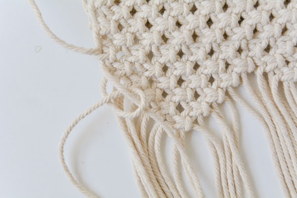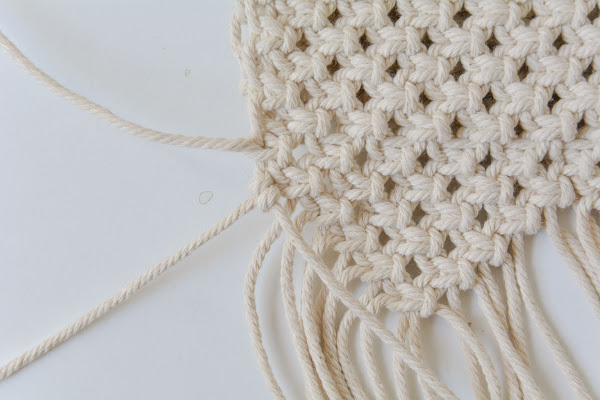 Como las cuerdas se van deshilando con el uso, para evitar que se nos deshagan mucho, podemos hacer unos nudos en el borde. Yo los he hecho cada 4 cuerdas, pero podéis hacerlo en cada una si os gusta más. Y para terminar con la tapa, cortamos los flecos a la longitud que nos guste.