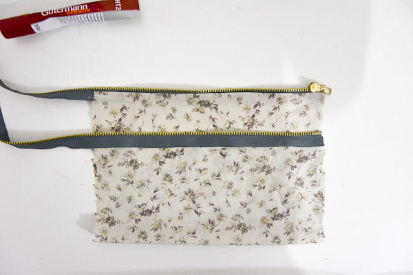 Con la cremallera cerrada, pegamos uno de los lados. Según veis en la foto de abajo, tenemos que pegar la tela con la parte bonita vista por dentro de la cremallera. Dicho de otra forma, pegamos la parte del dobladillo contra la parte inferior de la cremallera