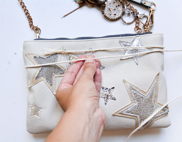 Esta cuerda más larga la vamos a usar para sujetar todas las demás y que nos sirva para cerrar el bolso y que quede más compacto.
