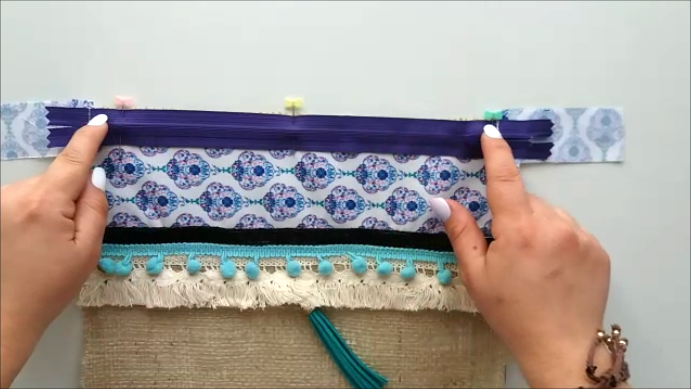 Luego para cerrar el bolso, se abre la cremallera más o menos a la mitad y se unen por un lado la tela de saco y por otro las telas del forro y se cose todo alrededor,