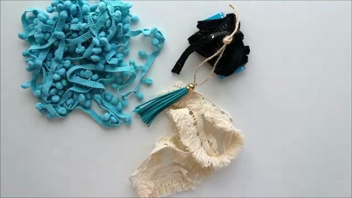 Y aquí deja volar tu imaginación. Por mi parte he usado unos flecos cortos, pompones, una borla y lentejuelas.