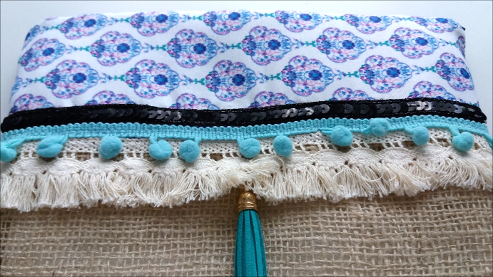Empezamos decorando la parte exterior, yo sólo lo he hecho en lo que será la cara principal del bolso. Le puse una pieza de tela estampada y los flecos, pompones etc. además de una pequeña borla en medio.