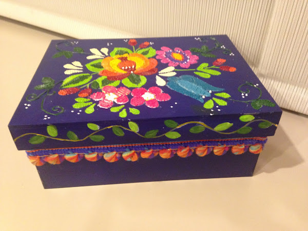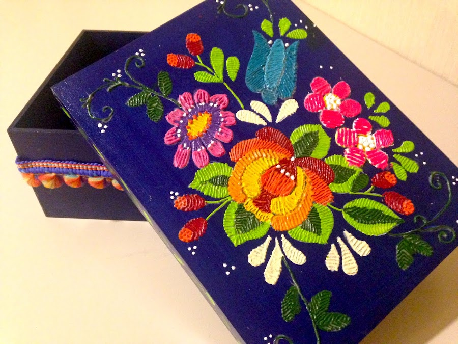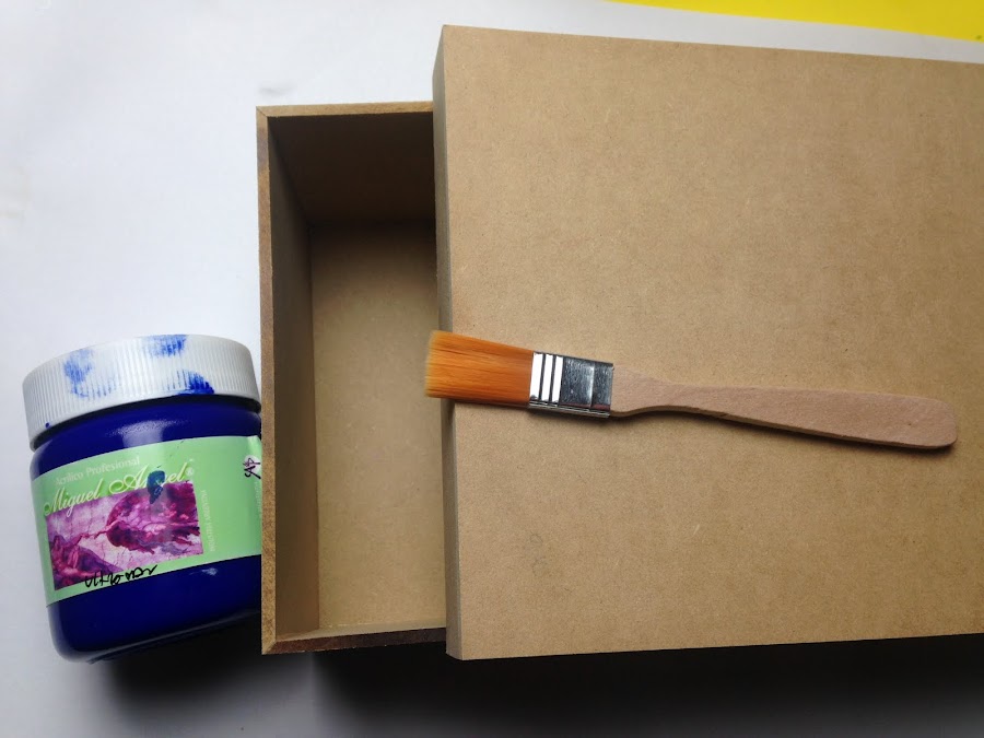 A la caja le di dos manos de pintura acrílica azul ultramar, lijando luego que se secó la primera mano.