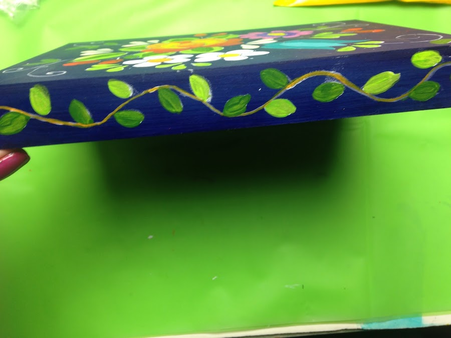 De la misma manera para el borde de la tapa. Le realicé una guarda que solo tiene una rama en forma de ondas y hojitas alrededor. Este dibujo lo hice con un lápiz blanco.